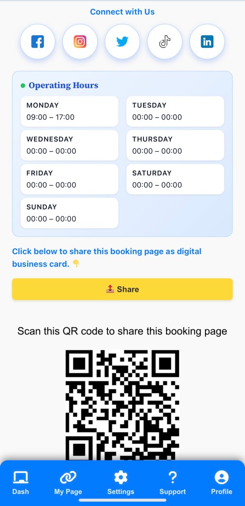 Each subscriber gets a unique booking page URL and a scannable QR code. Share it on business cards, car stickers, flyers, social media, WhatsApp, and Google Business to get more direct bookings.